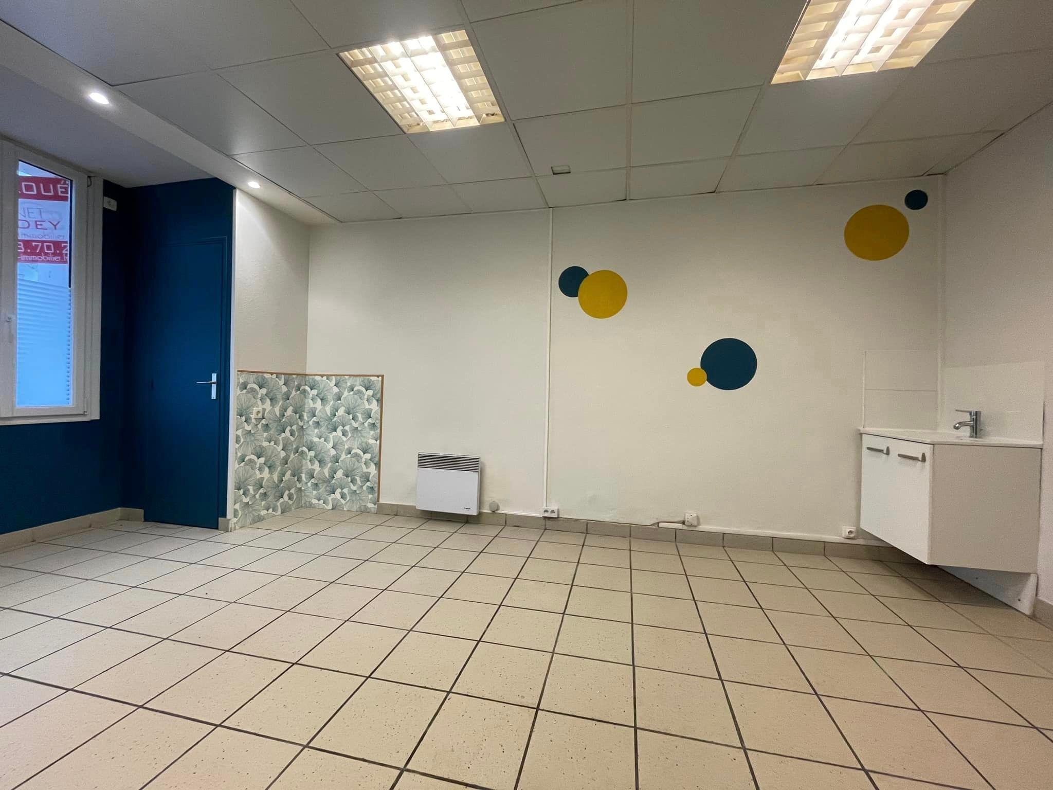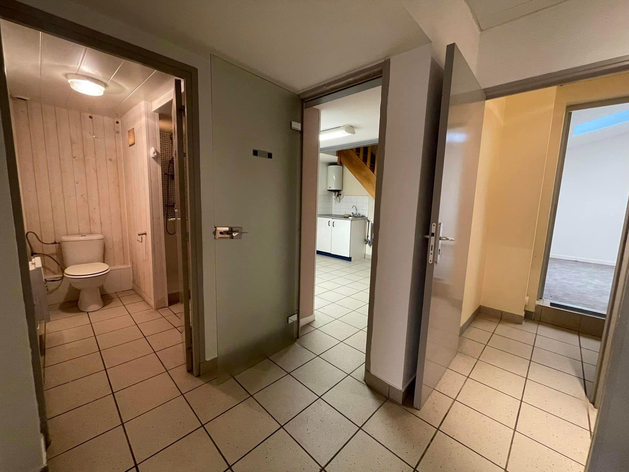 un grand bureau de 20m2 avec placards, une kitchenette séparée, un WC séparé et une salle de douche,